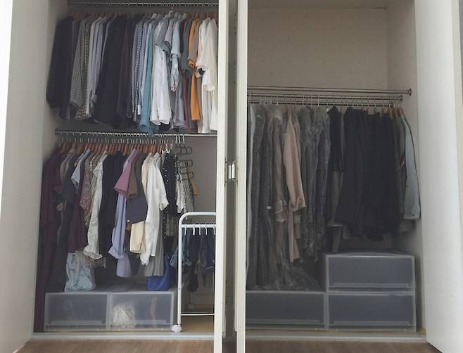색색깔의 옷이 그대로 드러나면 아무리 깔끔하게 정리해도 지저분해 보이기 쉬운 것 같아요. 그렇다고 매번 옷들을 색깔별로 분리해서 정렬하는 것도 어렵구요.