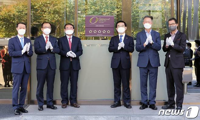 (인천=뉴스1) 정진욱 기자 = 한무컨벤션(주)에서 운영하는 오크우드 프리미어 인천이 한국관광협회중앙회가 시행하는 호텔 등급심사에서 가족호텔로서 최초로 최고 등급인 5성 등급을 획득했다. 22일 심영철 오크우드 프리미어 인천 총지배인, 주시보 ㈜포스코인터내셔널 사장, 조윤영 한무컨밴션㈜ 사장, 더불어민주당 정일영 국회의원, 민민홍 인천관광공사 사장 ,이임혁 인천시관광협회 회장(사진 왼쪽부터)이 오크우드 프리미어 호텔 앞에서 현판식을 하고 있다. 2021.10.22/뉴스1