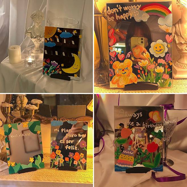 거울에 그림을 그리는 경험은 누구에게나 생소할 것이다. 면 혹은 종이 캔버스가 아닌 거울에 그림을 그려 소품을 만들 수 있는 원데이 클래스가 있다. 상상력을 발휘해 거울에 원하는 그림을 그리면 오직 하나뿐인 거울이 탄생한다. 소품으로 두어도 감성적이고, 실제 거울로 사용해도 매일 보는 즐거움이 생길 듯하다.