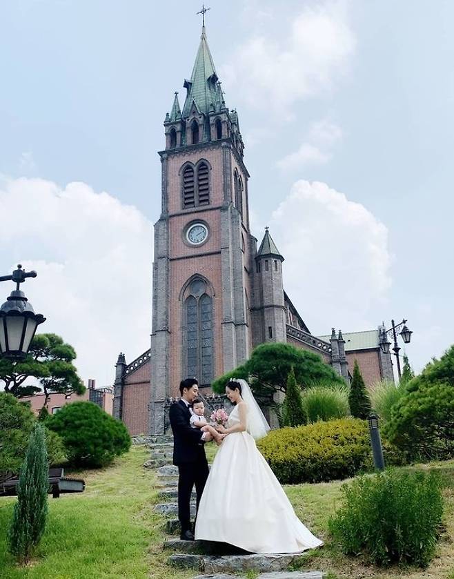 사진 속 이영아는 남편과 함께 명동대성당을 배경으로 드레스와 턱시도를 차려입은 신혼부부와 아이의 모습을 선보이며 주변의 부러움을 샀습니다.