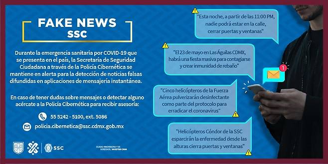 '밤 11시 이후 통행금지가 실시된다', '5월 23일 La Aguila 동네에서 집단면역을 높이기 위해 대규모 시민들이 모여 파티를 할 것이다', '시민안전청 소속 헬리콥터 다섯 대가 멕시코시티 상공에서 코로나바이러스를 박멸하기 위해 소독약을 뿌릴 것이니 모월 모일 모시에 창문을 닫아라', 혹은 '시민안전청 소속 콘도르 헬기가 고공에서 질병 바이러스를 뿌릴 것이니 모두 외출을 삼가고 창문을 닫아걸어라' 등이다.