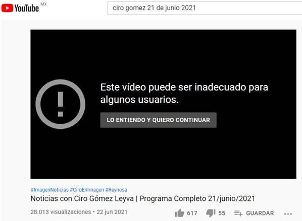 | ▲ 멕시코 공중파 방송 중 하나인 Imagen 채널의 Ciro Gomez Leyva가 진행하는 메인 뉴스를 재생해주는 6월 21일자 YouTube 동영상 첫 화면. '이 동영상 시청은 일부 사람들에게 적절치 않을 수 있습니다'라는 안내 자막을 띄우고 보기를 원하는 사람들만 아래 이어지는 '이해합니다. 그럼에도 보기를 원합니다'라는 옵션을 선택하여 시청하도록 했다. |