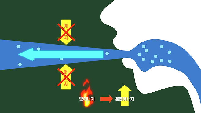 그런데 '호~'를 했을 때는 입을 오므리고, 숨을 입 밖으로 빠르게 뱉습니다. 그러면 순간적으로 부피가 팽창하므로 외부와 열교환 없이 부피가 늘어나는 단열팽창이 일어나는데, 팽창할 때 내부 에너지를 사용하므로 에너지가 감소해 온도가 낮아지게 되어 시원한 바람이 나오게 됩니다.