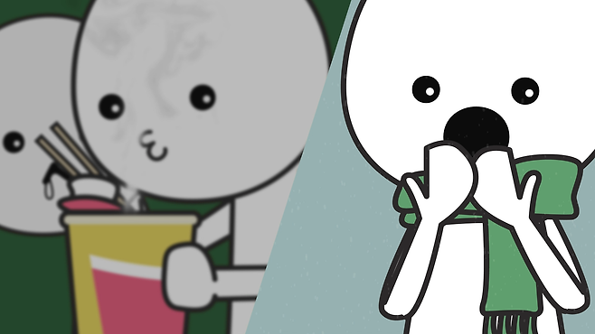 그런데 입김이 나오기 위해서는 입을 살짝 벌린 '하~'가 되어야 합니다. 그래서 보통 음식을 식힐 때는 '호~ 호~' 불고, 추워서 손을 녹일 때는 '하~ 하~'를 하게 됩니다. '하~'를 했을 때는 공기가 상대적으로 천천히 빠져나오므로 사람의 체온과 비슷한 온도의 숨을 느낄 수 있어서 따뜻합니다.