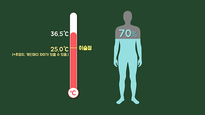 이슬점의 개념을 이해했다면 입김에 관한 이야기로 다시 돌아가보겠습니다. 사람의 호흡을 통해 나온 숨에는 수분이 많습니다. 숨은 체온과 비슷한 36.5℃ 정도이나 체내의 70%가 물로 이루어져있기 때문에 이슬점의 온도는 25℃(=36.5*0.7) 정도로 추정할 수 있습니다.