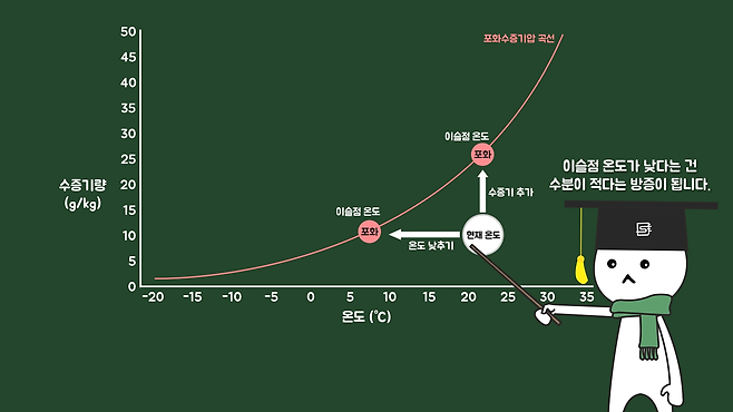 이때 대기 중 공기의 수분이 포화(상대습도 100%)되면 기체 상태로 존재하지 못하므로 액체 상태인 물방울이 되는데, 이때의 온도가 이슬점과 같아집니다.