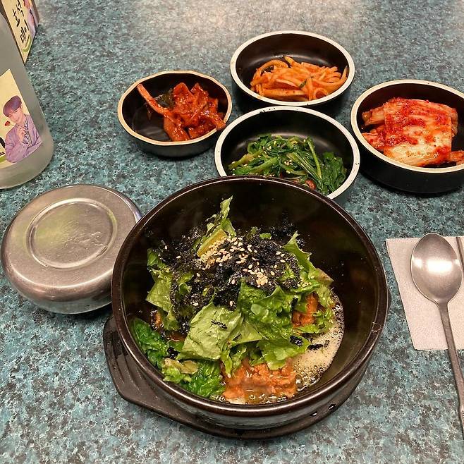 ▲후기(식신 LoveMe♡): 돌고 돌아 찾아간 BTS 방탄소년단 맛집, 아미 맛집, 유정식당!! 벽이고 유리고 천장이고 할 것 없이 죄다 방탄 사진과 굿즈로 되어있어서 아미로서 행복했다,, 여기 왔으면 흑돼지 돌솥비빔밥 먹어줘야죠~!! 된장찌개도 같이 나와서 너무 좋고 고기도 많이 들어있음! 사진 찍어대서 그런지 굿즈도 챙겨주심,, 행복,,,,
