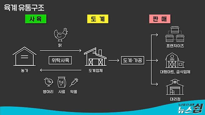 작은 닭이 생산되는 이유에 대해 '소비자가 원하기 때문'이라는 답보다 좀 더 설득력 있는 답을 찾으려면 '육계 산업'이 어떻게 돌아가는지 들여다볼 필요가 있다. 우리나라 닭 생산 시장은 '계열화 사업' 형태로 이뤄져 있다. 육계 업체가 양계 농가에 병아리, 사료 등을 공급하고, 닭이 다 자라면 계약 조건에 따라 닭을 출하받고 수수료를 지급한다.