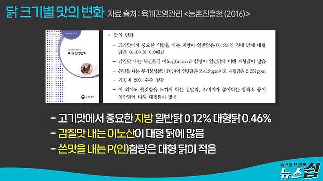이 내용이 담긴 글의 원문이 되는 논문을 살펴봤다. 농촌진흥청이 2011년에 내 놓은 '육계의 사육 일령에 따른 닭고기의 이화학적 특성에 미치는 영향'이라는 논문이다. 이 논문에 따르면 닭이 커질수록 감칠맛이 나는 이노신 함량은 증가하고, 쓴맛이 나는 인 함량이 감소한다고 돼 있지만, 닭이 커질수록 쓴맛이 나는 하이포크산틴 함량도 늘어났다.
