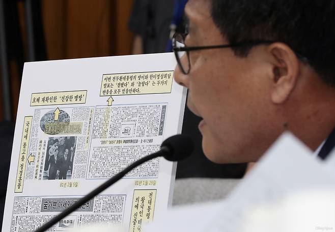 | ▲ 김광수 국민의당 의원이 지난 2017년 5월 24일 이낙연 국무총리 후보자에 대한 국회 인사청문회에서 이 후보자가 동아일보 기자 시절 쓴 기사를 들어보이며 질의하고 있다. |