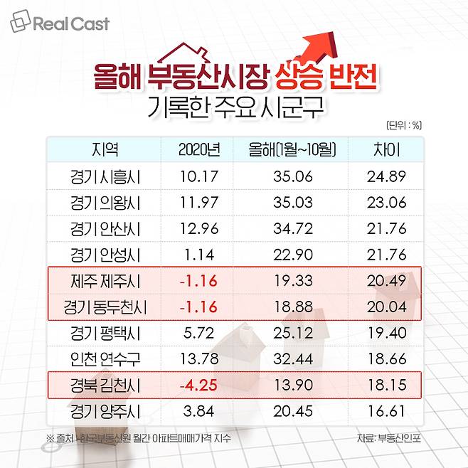 비교 분석은 올해 1월~10월 매매가격지수 누적 변동률에서 2020년 1월~12월 매매가격지수 누적 변동률 간의 차이로, 지난 해에도 플러스 변동률을 기록하고 올해도 플러스 변동률을 기록하며 상승세를 이어간 곳들도 있으나 제주시와 경기 동두천시는 2020년 마이너스 변동률을 기록했다가 올해는 플러스 변동률로 급 반등했습니다.