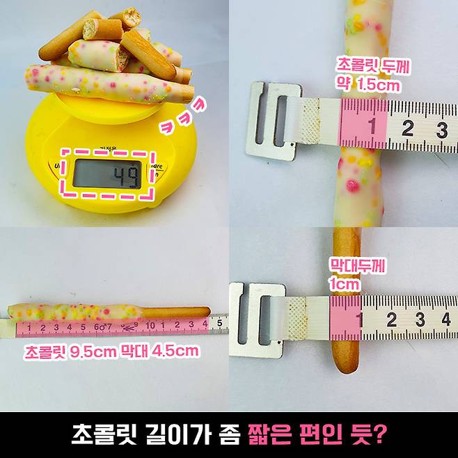 부서진 조각들 열심히 모아 모아서 무게 확인해 봤어요ㅋㅋㅋ 다행히 무게는 안정권~ 막대 두께는 1cm로 손가락만 한 두께였어요! 그런데 초콜릿 부분이 다른 빼빼로들에 비해 짧은 편인 듯?