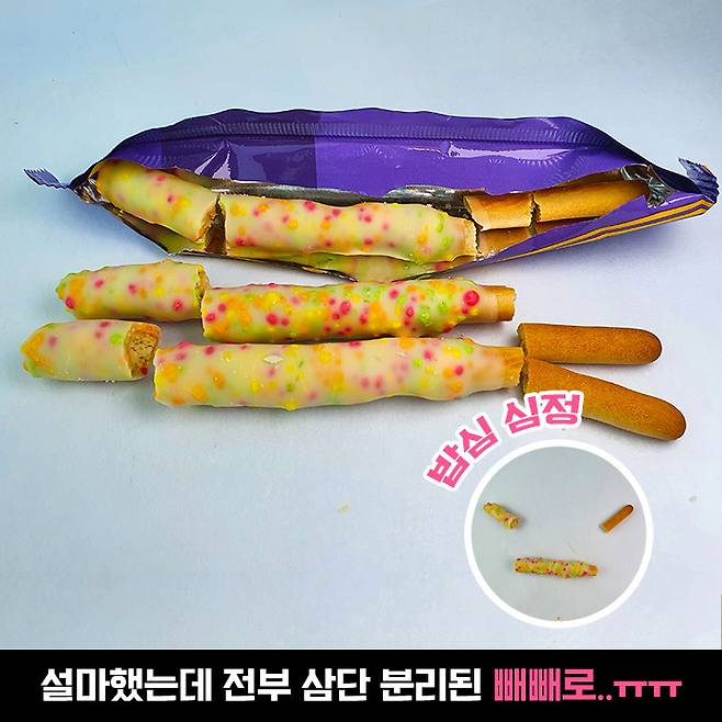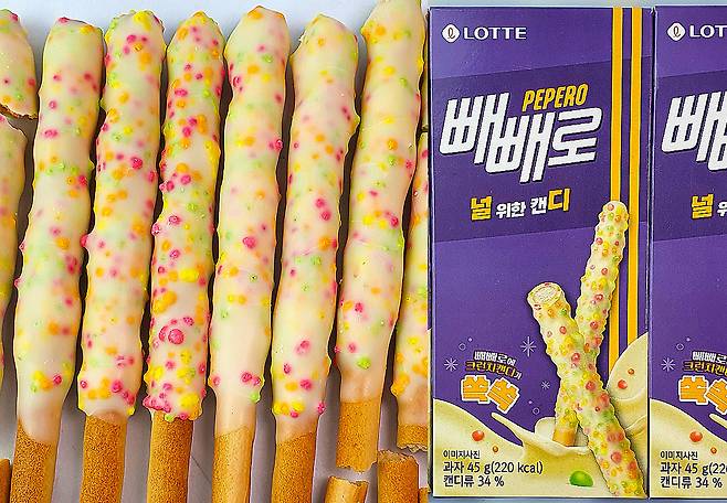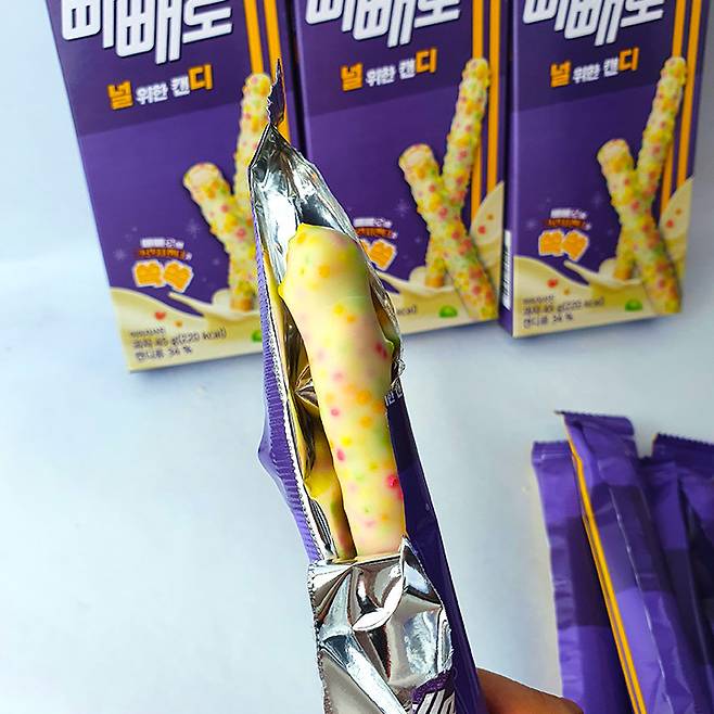 패션 브랜드랑 콜라보로 나온 것만으로도 흥미로운 빼빼로! 힙한 비주얼에 어울리는 상큼 달달한 맛이 인상적이네요. 화이트초코?는 그다지 달지 않고, 안에 콕콕 박힌 사탕이 새콤한 맛이 났어요. 하지만 기존의 아몬드 빼빼로나 진짜 수제 빼빼로의 맛에 익숙한 사람이라면 당황스러운 맛일 것 같아요. 그리고 3개만 들어있을 때의 충격이란... (말잇못)