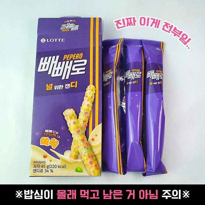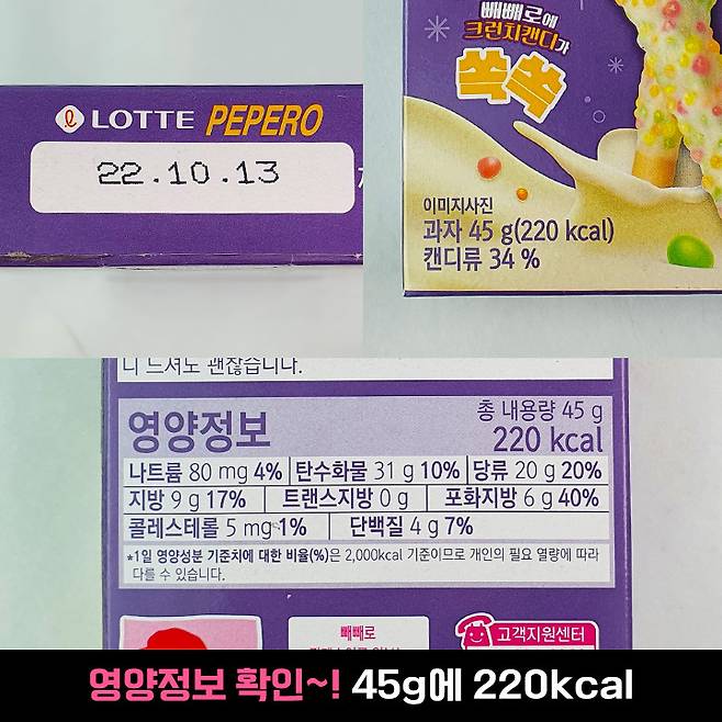 45g에 220kcal이고 유통기한은 넉넉~ 참고로 오리지널 빼빼로가 46g에 235kcal에요.