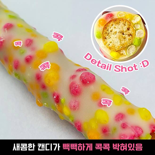 도깨비방망이가 제 혓바닥을 마비시키는 듯. 너무 달아서 기절할 것 같은 맛이에요. 당뇨 걸리게 하고 싶은 친구에게 "널 위한 캔디"를~ 그래도 특히 수제 빼빼로를 연상시키는 두꺼운 스틱이 맛있었어요. 두꺼워서 공기층이 있어서 부드럽게 부서졌어요. 식감을 중시하는 사람들에게 딱~! 똑같은 스틱으로 다른 맛이 나온다면 맛있게 먹을 것 같아요.