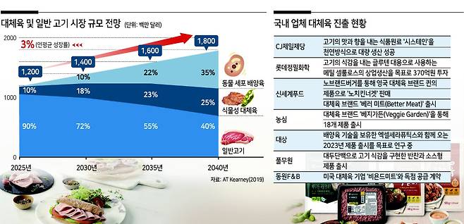 이에 따라 국내 업체들도 경쟁적으로 이 시장에 진출하고 있다. CJ제일제당은 최근 고기의 맛과 향을 내는 식품 원료 ‘시스테인’을 천연 방식으로 대량 생산하는 데 성공했다. 롯데정밀화학은 내년 상반기께 고기의 식감을 내는 글루텐 대용으로 쓸 수 있는 메틸 셀룰로스의 상업생산을 위해 370억원 투자했다. 대상은 배양육 기술을 보유한 엑셀세라퓨틱스와 함께 오는 2023년 제품 출시를 목표로 연구 중이다.
