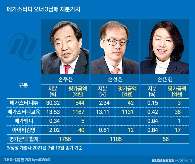 뒤늦게 경영일선에 합류한 손은진 대표는 오빠들에 비해 상대적으로 계열 지분이 얼마 되지 않았다. 메가스터디㈜(0.15%), 메가엠디(0.04%), 아이비김영(0.84%) 등 각각 1%도 안되는 3개사 지분으로 현 주식시세로 매겨 봐도 합해봐야 20억원(13일 종가 기준) 정도다.