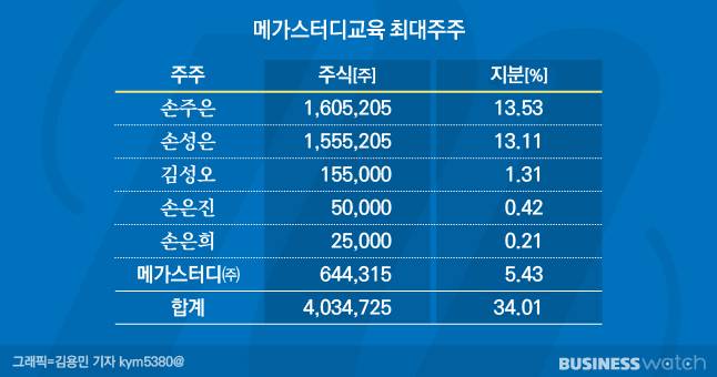 양대 계열사 최상단에 위치한 이가 실권자 손 회장이다. 메가스터디㈜ 지분 30.32%, 메가스터디교육 13.53%를 가진 1대주주다. 단 한 주의 오차도 없이 메가스터디교육 공동 1대주주로 있던 손성은 대표의 경우 이번 증여를 계기로 줄기는 했지만 현 지분이 13.11%나 된다. 메가스터디㈜도 2.34%를 갖고 있다.