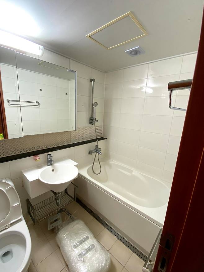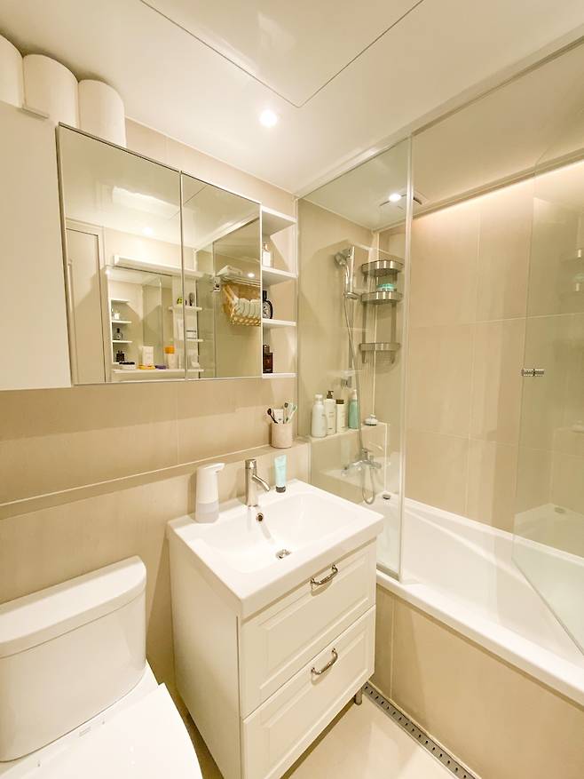 욕실의 경우 구조는 크게 바꾸지 않고, 욕조에 부스를 설치했어요. 부스를 설치하면 기능적으로 건식과 습식을 함께 사용할 수 있어서 욕실을 깨끗하게 관리하기가 쉽고, 곰팡이가 생길 일을 줄일 수 있어요.