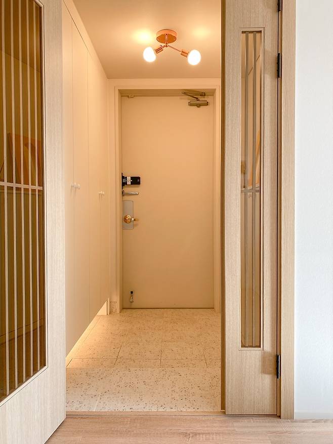 중문은 깔끔한 우드로 제작하고, 안이 훤히 들여다보이지 않도록 나무 창살을 넣었어요. 현관은 좋은 기운이 드나드는 통로 역할을 하기 때문에, 늘 깨끗하고 깔끔하게 유지를 하는 게 좋다고 해요. 그래서 신발장과 우산장을 설치했고, 바닥은 띄워서 간접조명으로 센서 등을 같이 넣었어요.