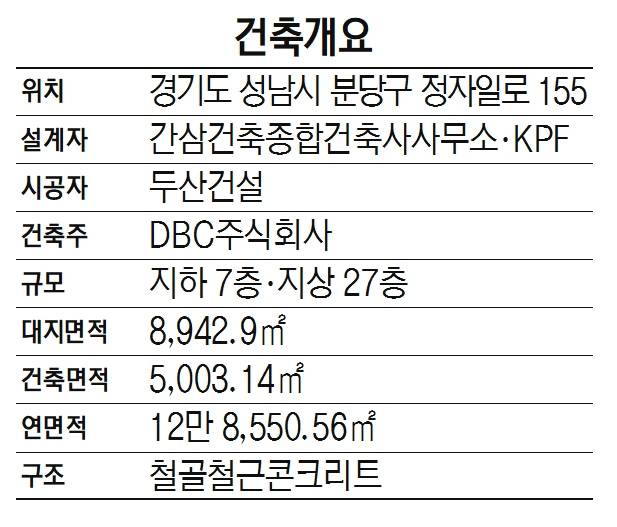 경부고속도로 서울 나들목 가까이 자리잡은 분당 두산타워는 지하 7층·지상 27층, 연면적 13만 여㎡에 달하는 육중한 건물이다.