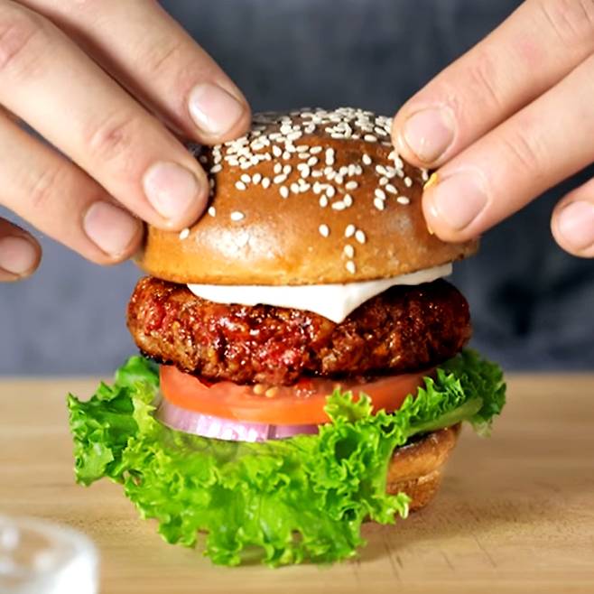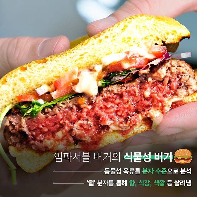 임파서블 버거 속 패티는 고기 대신 아몬드, 마카다미아 오일 같은 식물성 원료를 사용했지만 일반 버거 와 비슷한 맛이 나는데요. 프라이팬에 구우면 표면은 갈색으로 바뀌고, 베어물면 육즙이 나와요. 임파서블 버거 패티의 특징은 단순히 야채와 콩을 모아서 고기와 유사하게 만든 것이 아니에요. 고기를 분자 수준으로 분석해 이와 가장 비슷한 '헴' 분자를 통해 향, 식감, 색깔, 풍미 등 고기의 특성을 그대로 살려냈죠.