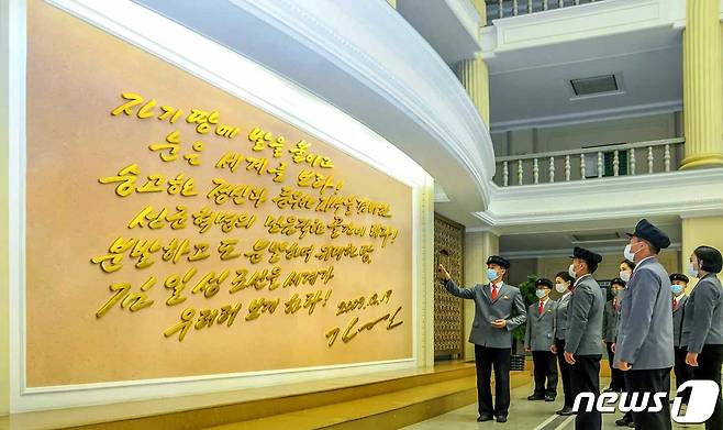 (평양 노동신문=뉴스1) = 북한 노동당 기관지 노동신문은 8일 김정일 국방위원장 사망 10주기(12월17일)를 앞두고 "깊은 밤, 이른 새벽에도 조국과 인민을 생각하며 일손을 놓지 않았다"라고 추모했다. 사진은 "자기 땅에 발을 붙이고 눈은 세계를 보라"는 김정일 위원장의 글을 읽고 있는 북한 대학생들.