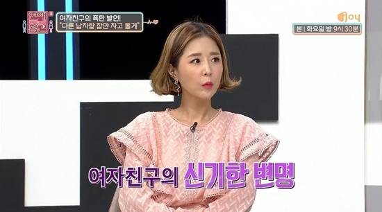 바람을 피우는 건 아니니 떳떳하다고 말하는 여친의 모습을 보며 신지는 "내 전 남친은 핸드폰이 2개였는데 떳떳하다고 말하더라. 하지만 결론은 떳떳하지 않았다"라는 경험담을 털어놓으며 "여기서 더 나아지지 않을 것 같으니 정리를 해라"라고 조언했다.