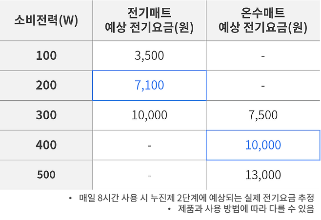 일반적으로 2인용 기준 소비전력은 전기매트가 100~300W, 온수매트가 200~500W로 온수매트가 더 높습니다. 그렇지만 이는 최대 온도를 맞추기 위해 소비되는 최대 전력량을 의미하는 것인데요. 실제로 목표 온도에 도달한 후에는 전력 사용량이 줄기 때문에 전기 요금은 소비전력보다 적게 나옵니다.