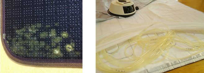 반면 다 그런 것은 아니지만, 온수매트는 제조사와 사용 정도에 따라 물이 샌다거나 보일러/모터의 고장, 열에 의한 변화/경화 등이 발생할 수 있습니다.