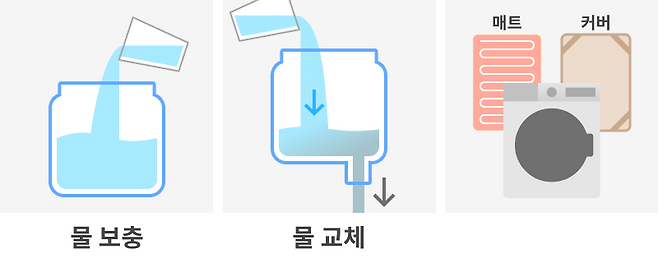 온수매트는 '보일러'가 있어 주기적으로 관리해주어야 합니다. 사용 환경이나 제품에 따라 다르지만 10~30일 주기로 1~2컵의 물을 보충해야 합니다. 물 보충 외에도 2~3개월 간격으로 물을 빼서 청소하고, 물을 교체해야 하는 등 번거롭게 느껴질 수 있습니다. 청소를 하는 것만큼 잘 말리는 것도 중요한데, 매트 안의 호스도 곰팡이가 생기지 않도록 최대한 건조하게 유지해야합니다.