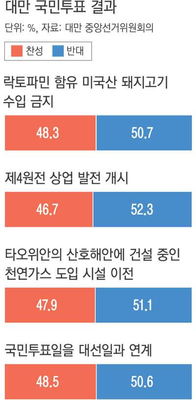 국민투표에 부쳐진 ‘제4원전 상업운전 개시’ ‘락토파민 함유 미국산 돼지고기 수입 금지’ ‘국민투표일과 전국 선거 연계’ ‘타오위안(桃園) 조초(藻礁·산호의 한 종류) 해안에 건설 중인 액화천연가스(LNG) 시설 이전’ 등 4개 안건 모두 반대표가 더 많아 부결됐다. 이들 안건은 모두 집권 민진당 정부가 추진하는 정책에 반하는 것이어서 이번 국민투표가 사실상 차이 총통에 대한 중간평가 성격을 띤다는 해석이 지배적이었다.