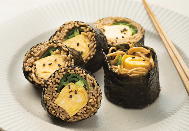 메밀면의 식감과 특유의 구수함이 매력적인 김밥이에요. 열량도 낮아 밥대신 간편하게 만들어 먹기 좋아 자주 해먹는 레시피랍니다.