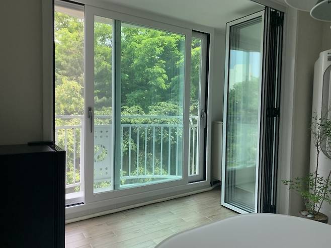 첫째는 '비용'이고, 둘째는 거실 양쪽 날개벽이 두꺼운 내력벽이라 철거가 불가능한 상황이었는데, 투자 대비 시원한 느낌이 덜 할 것 같다는 점에서 아쉽지만 폴딩도어를 설치했습니다. 어떤 타협점을 찾은 거죠. 이렇게 봄, 가을에는 폴딩도어를 열어두고 겨울에는 폴딩도어를 닫아두고 살고 있어요.