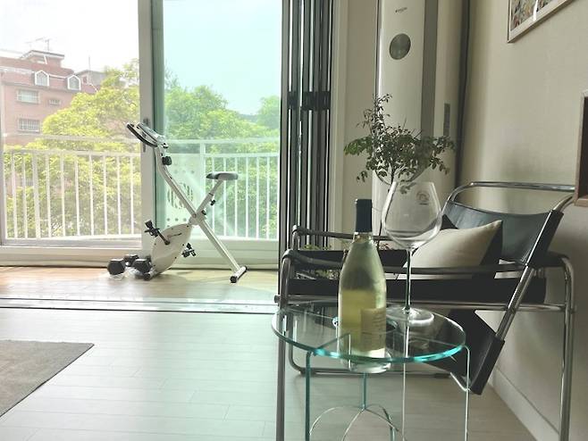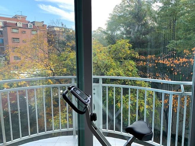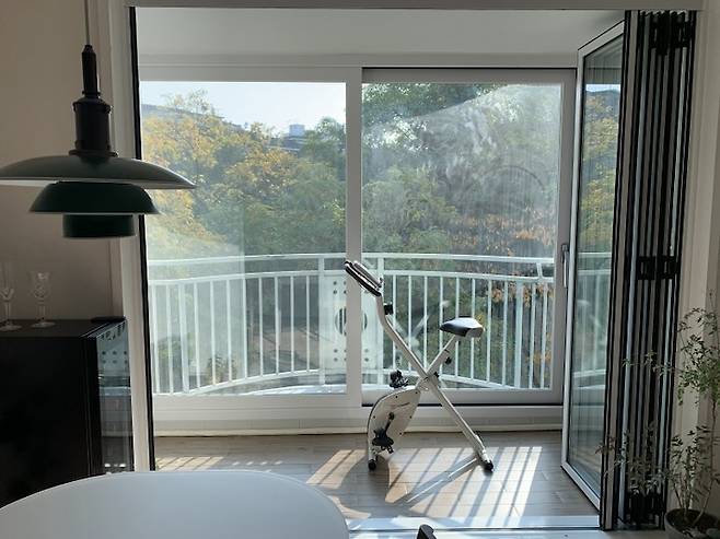 마지막으로 저희 집 거실 내 베란다 공간의 활용! 바로 운동 공간이 됩니다. 베란다에 둔 자전거를 탈 때 자연을 보면서 탈 수 있어서 조금은 힘듦이 덜..해...진.. 힘들다... 아무튼, 베란다 바닥이라 부담도 덜하고 층간 소음 이슈 없이 운동을 편하게 하고 있습니다.