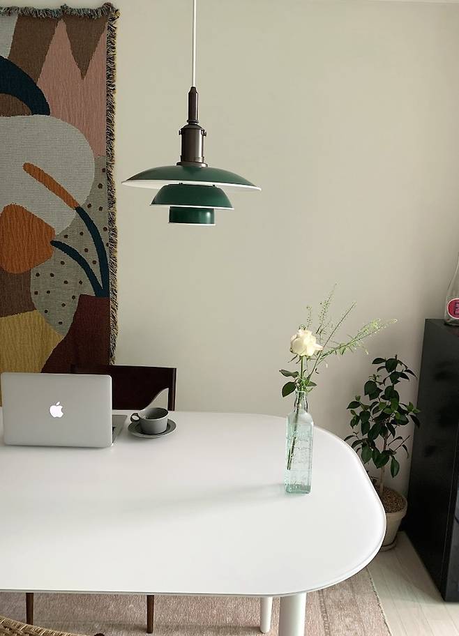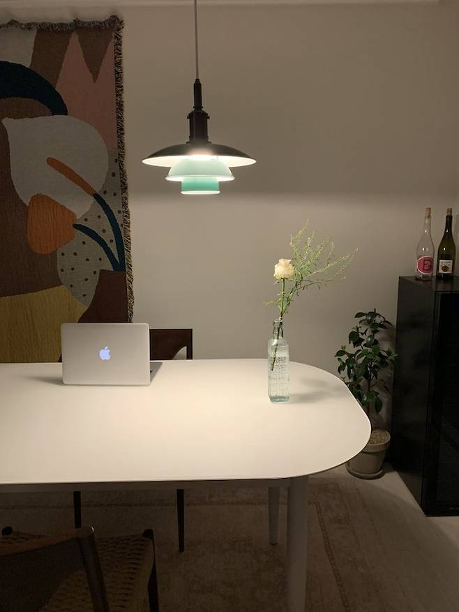 거실 공간에 블랭킷 컬러가 더해지니 유니크하면서도 생동감이 있는 분위기로 변했습니다.사실 저는 유니크한 것을 꽤 중시하는데 이제 이 브랜드가 너무 유명해져서 조금 아쉬운(?)마음도...^^ 옆의 루이스폴센 그린 조명과도 잘 어울리는 것 같아 만족해요.
