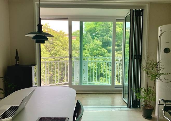 사실 서울에서 이렇게 초록초록한 풍경이나, 가을에는 울긋불긋, 겨울에는 눈 내리는 모습까지 모두 다 한 창으로 볼 수 있는 곳을 찾기가 쉽지 않았는데, 운 좋게도 제가 만난 이 집은 한 계절 한 계절마다 모두 다른 모습을 보여주는, 그래서 지루할 틈이 없는 그런 거실을 가진 집이었습니다.