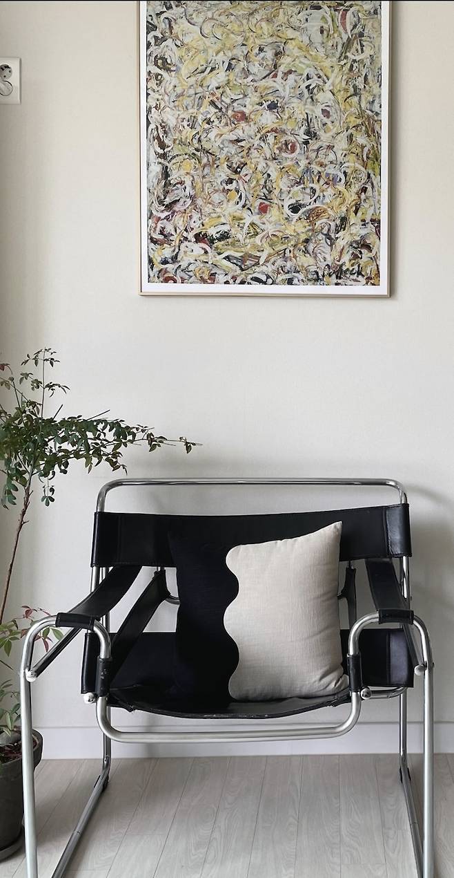 20평대 구축 아파트다 보니 실질적으로 소파까지 둘 공간은 없어서, 바실리 체어를 조금 편하게 앉는 의자로 삼고 있습니다.