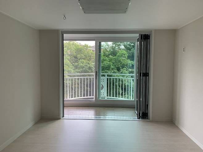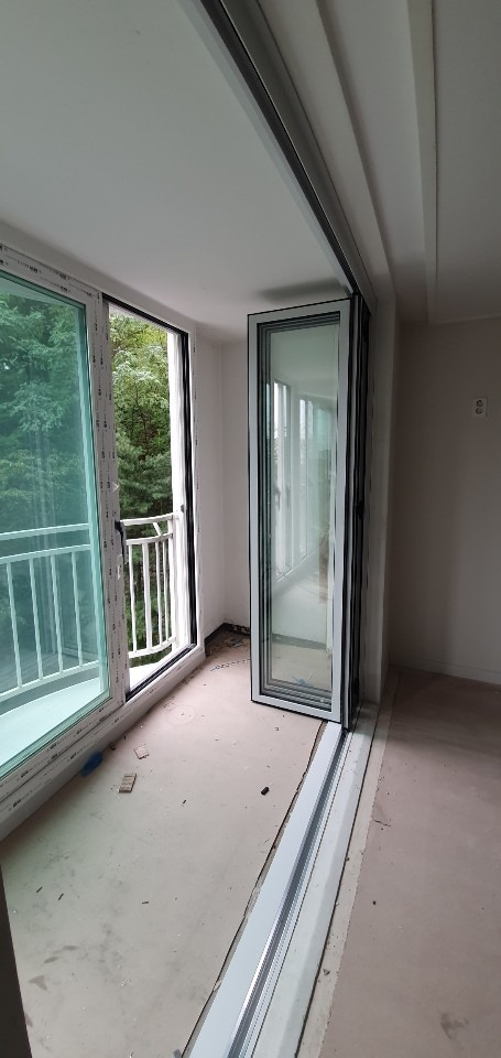 저희 집은 따로 폴딩도어를 위한 프레임을 제작하진 않았습니다. (목공을 안 했다는 뜻) 기존 베란다 내창을 철거한 자리를 전처리 한 후 폴딩도어를 설치했는데요. 덕분에 시야에 걸리는 게 없고 산뜻합니다. 벽지와 바닥, 그리고 폴딩도어를 흰색 계통으로 맞추었습니다.