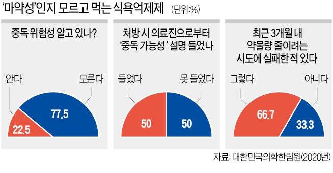 하지만 대다수 사람은 A씨와 같이 식욕억제제의 위험성을 인지하지 못하고 있다. 지난해 한국리서치와 대한민국의학한림원이 성인남녀 1020명을 대상으로 설문조사한 결과 식욕억제제 중독 위험성을 알고 있는 사람은 22.5%에 불과했다.