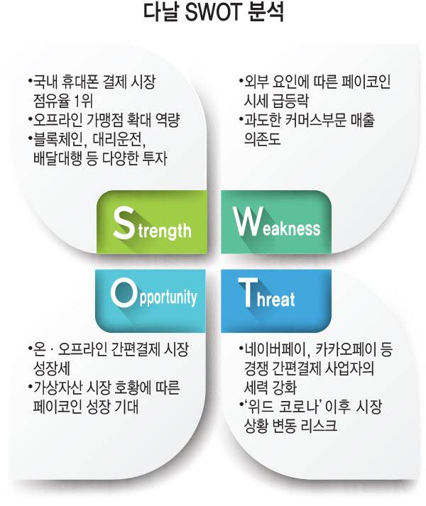 자회사 다날핀테크와 페이프로토콜AG를 통해 개발 및 운영 중인 가상자산 '페이코인' 성장세는 기회 요인이다. 블록체인 기반 가상자산 플랫폼을 기반으로 개발된 페이코인은 현재 빗썸, 후오비코리아, 지닥, 코인원 등 국내 주요 가상자산거래소에 상장돼 꾸준하게 거래되고 있다. 다른 가상자산과 달리 실생활 결제에 사용할 수 있는 특장점을 갖고 있다.