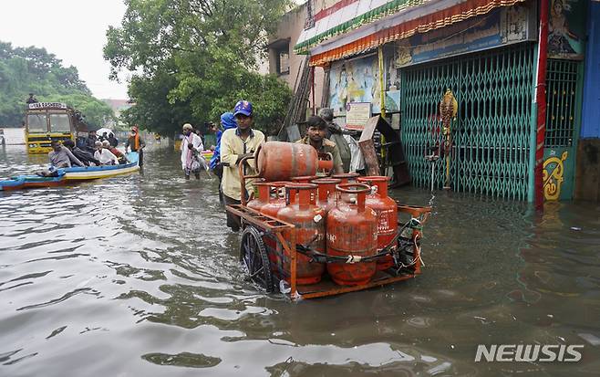[첸나이=AP/뉴시스] 인도 타밀나두주에 내린 폭우로 홍수가 발생해 10일(현지시간) 주도 첸나이의 침수 도로에서 두 남성이 가스통을 실은 손수레를 밀고 있다. 기상 당국은 11일까지 타밀나두주 전역에 폭우가 이어질 것이고 예보했다. 2021.11.11.