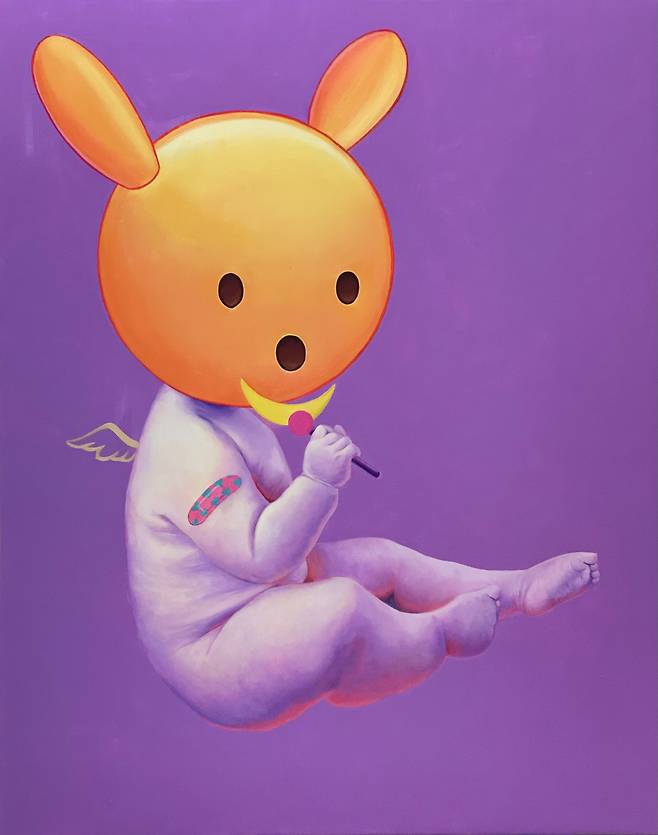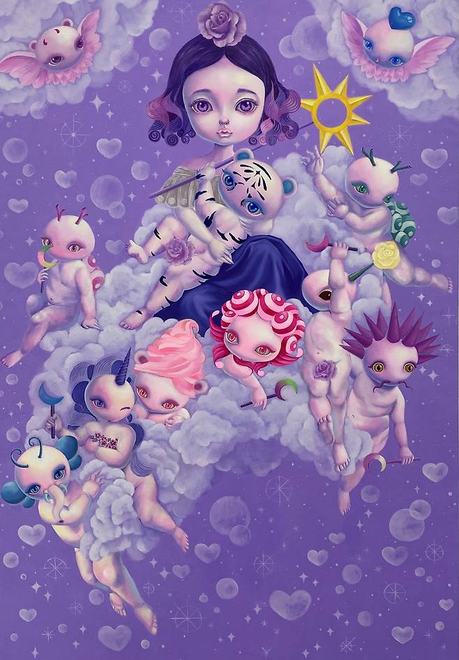 돌연변이들은 신화 속 동물들에게서 레퍼런스 되었는데 이들은 여러 동물들이 섞인 하이브리드인 경우가 많다. 이들이 현실에 존재한다면 돌연변이가 될 것이다. 나는 이들의 머리와 성모의 곁에서 승천하는 아기천사들의 몸을 믹스함으로써 하이브리드의 하이브리드를 구현해 내고자 했고 우리가 알고 있는 이미지를 섞고 또 섞는 작업이다.