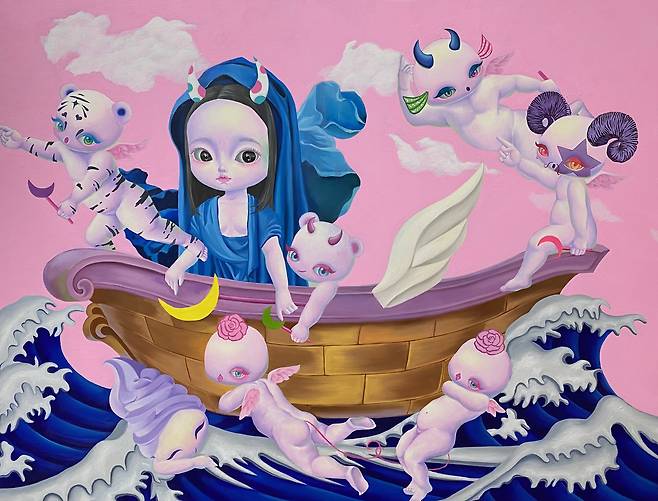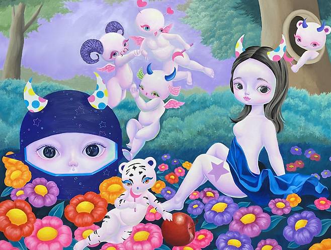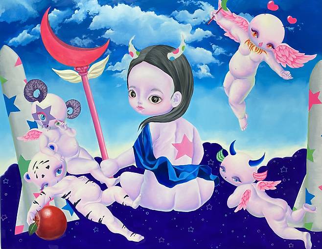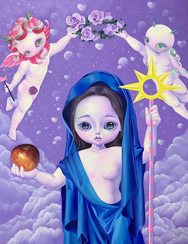 어린 소녀와 돌연변이들은 신화와 성경의 이야기 속에서 레퍼런스를 찾았다. 작업 중 성모와 이브를 믹스한 캐릭터가 있는데 이것은 긍정과 부정의 여성성의 대표 이미지들을 섞어 놓음으로써 우리가 알고 있는 이미 규정된 캐릭터에서 새로운 캐릭터가 탄생된다. 이것은 학습되어지고 당연하게 여기던 것들을 한 미술작가의 작은 힘으로 섞어버리고 표현함으로써 일종의 통쾌함과 표현의 자유를 누리는 것이다.