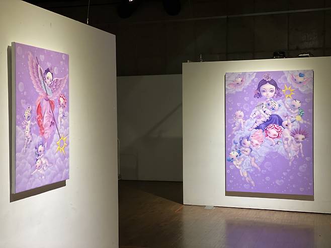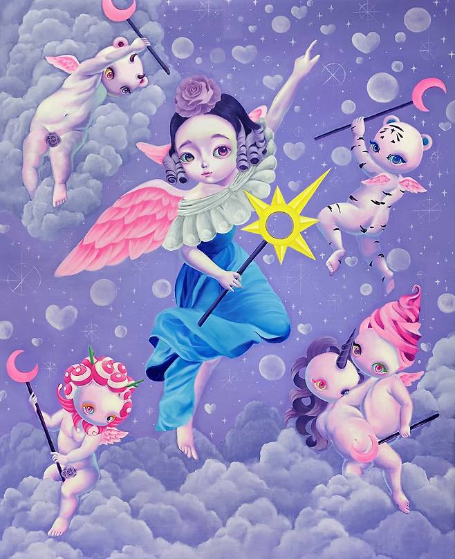 돌연변이들은 신화 속 동물들에게서 레퍼런스 되었는데 이들은 여러 동물들이 섞인 하이브리드인 경우가 많다. 이들이 현실에 존재한다면 돌연변이가 될 것이다. 나는 이들의 머리와 성모의 곁에서 승천하는 아기천사들의 몸을 믹스함으로써 하이브리드의 하이브리드를 구현해 내고자 했고 우리가 알고 있는 이미지를 섞고 또 섞는 작업이다.