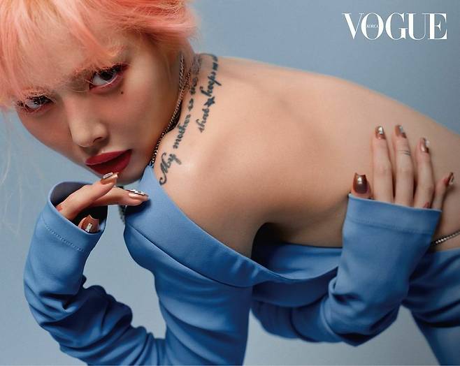 현아의 어깨의 있는 레터링과