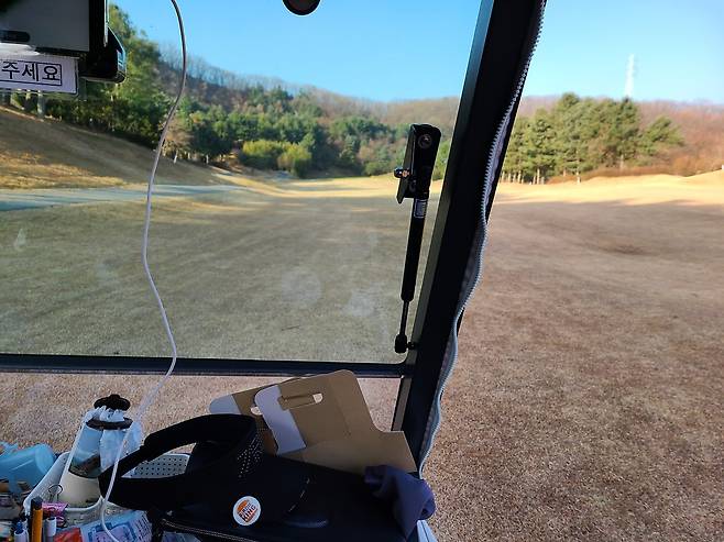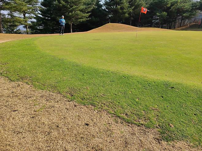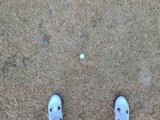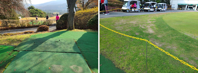 평일 그린피가 무려 24만 원이었음에도 18홀 모두가 인조 매트를 사용하도록 되었습니다. 미국 골프장은 그린을 펀칭하거나 티 박스를 인조 매트로 사용하면 약간 할인해 주는 터라, 이런 상황에도 그린피가 매우 비싸다는 점이 약간 충격이었습니다.