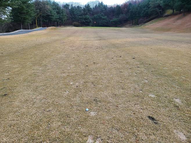 중지 페어웨이는 관리가 매우 필요한 상태입니다. 모래를 많이 뿌려놓았으며, 디봇도 거의 파낼 수 없을 정도로 땅이 푸석합니다. 많은 디봇은 제대로 수리하지 않아서 자주 디봇 자국에 들어가는 것을 볼 수 있습니다.