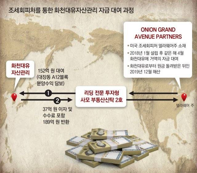 화천대유가 2018년 대장동 개발사업에서 추가 대출을 받기 위해 자본금을 마련해야 했고, 이 과정에서 거액의 대여금을 끌어왔다는 주장도 제기됐다. 대장동 사업의 한 관계자는 “급전을 마련해준 화천대유의 ‘전주’가 누구인지 드러내지 않기 위해 조세회피처의 해외 법인을 이용한 것으로 보인다”고 말했다. ‘어니언 그랜드 애비뉴 파트너스’가 152억 원을 투자한 ‘리딩 전문 투자형 사모부동산신탁 2호’에는 화천대유에 초기 자금을 빌려줬던 회사들도 투자자로 함께 참여했다.
