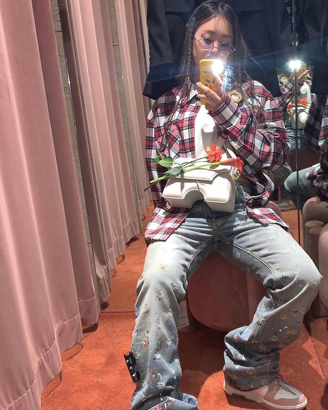 패턴+디테일+컬러 is 미란이. 타탄 체크 셔츠에 밑단의 페인팅 디테일이 유니크한 데님 팬츠를 매치했다. 언뜻 보면 과한 거 같지만, 이너 티셔츠, 숄더백을 화이트로 깔맞춤해 통일감을 줬다. 독특한 쉐입의 숄더백과 페인팅 디테일 데님은 오프화이트 제품.